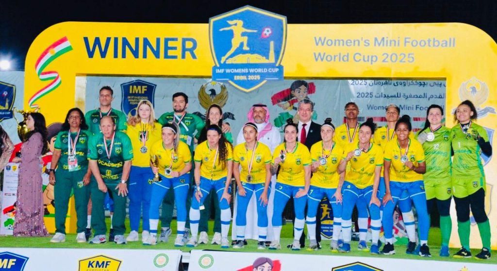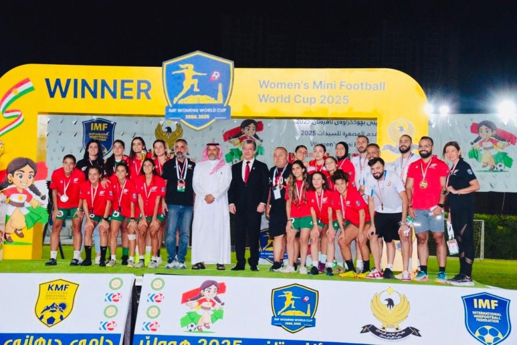 Erbil witnessed the finale of the Women’s MiniFootball World Cup on Monday evening, September 22, 2025. The event was held in a festive atmosphere at the Handrin Club Stadium, with a large crowd in attendance, led by the Prime Minister of the Kurdistan Regional Government, Mr. Masrour Barzani, and Dr. Mohammed Al-Dosari, President of the International Mini-Football Federation, along with a number of senior officials, including the Minister of Culture, Mr. Hama Saeed, and the Minister of Interior, Mr. Rebar Ahmed.